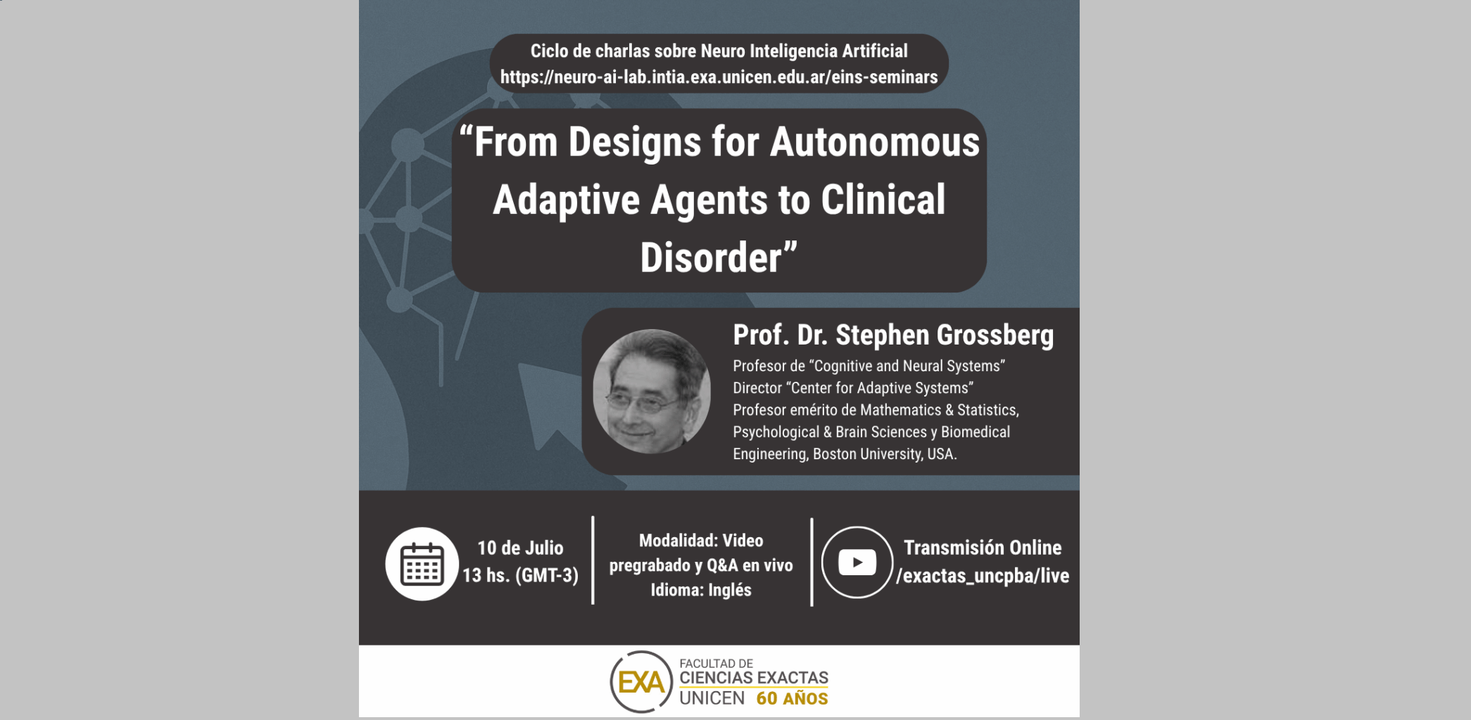 Compartimos invitación a la charla “From Designs for Autonomous Adaptive Agents to Clinical Disorder“ que brindará el Prof. Dr. Grossberg el próximo 10 de Julio a las 13 hs, con modalidad virtual (se transmite a través del canal de YouTube de la Facultad), siendo en primera instancia un video pregrabado y Q&A en vivo, el idioma de la misma será el Inglés y de accesibilidad gratuita. La misma forma parte de la Serie de seminarios en Neuro Inteligencia Artificial.