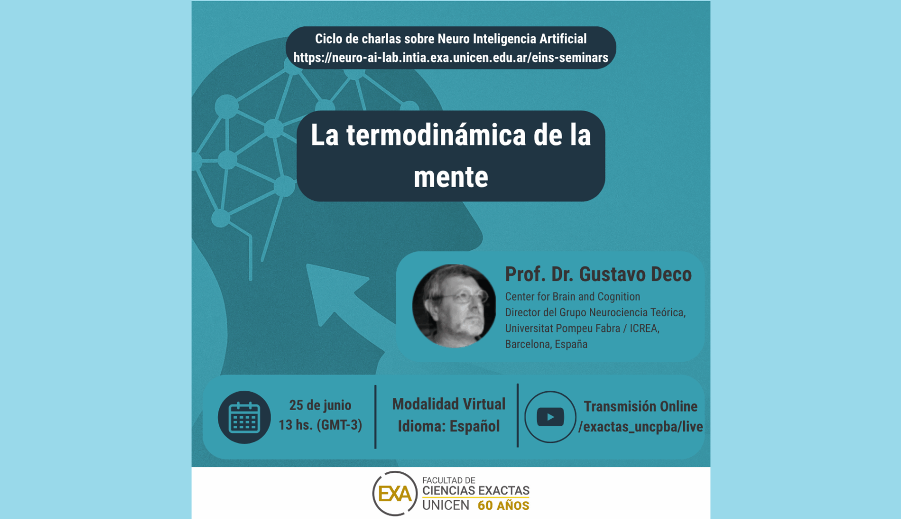 Charla dentro de la serie de seminarios avalado por el CIFICEN - “La termodinámica de la mente“ que brindará el Dr. Gustavo Deco el próximo 25 de Junio a las 13 hs, con modalidad virtual (se transmite a través del canal de YouTube de la Facultad) y gratuita. La misma forma parte de la Serie de seminarios en Neuro Inteligencia Artificial.