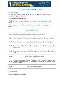 Nos es grato informarles las últimas novedades acerca de la organización del evento anual del CIFICEN ABIERTO 2025 que se desarrollará el próximo 5 de diciembre en el pabellón de Aulas comunes II, del Campus Universitario en Tandil, y que finalizará con un almuerzo de camaradería.