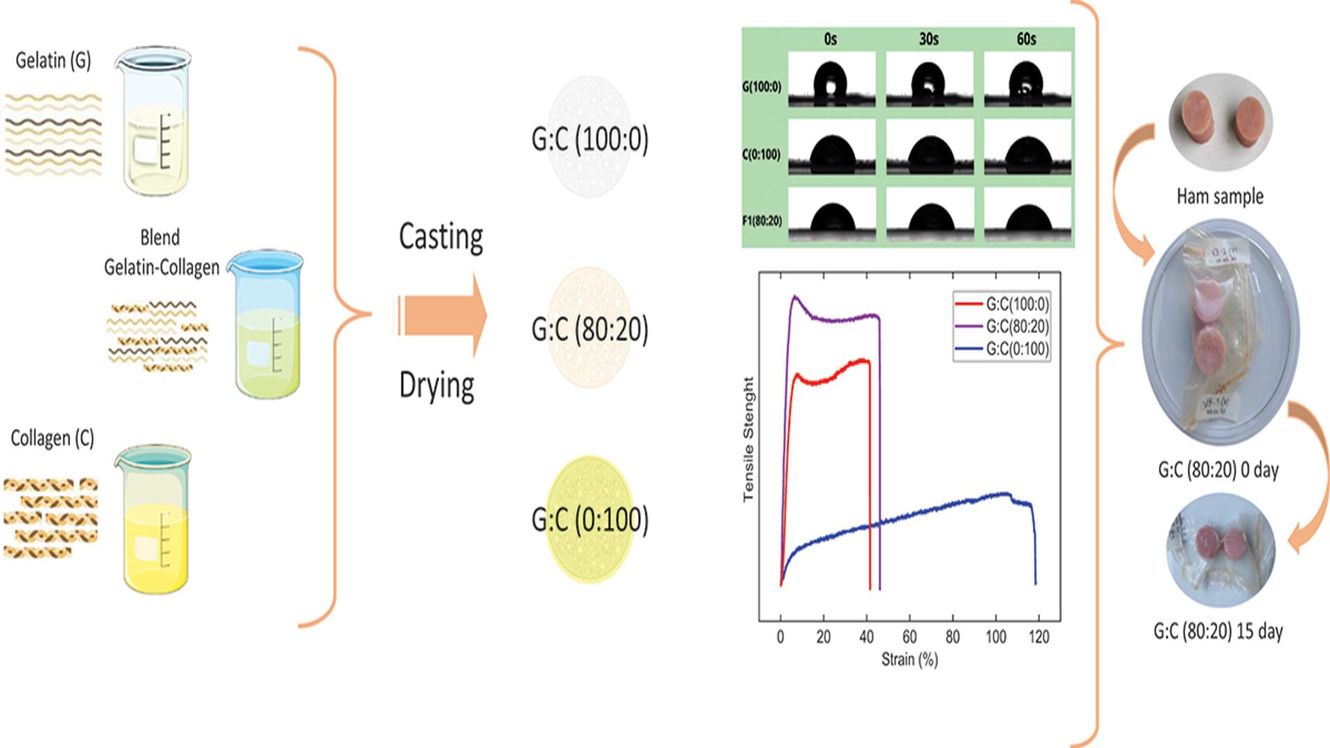 En el mismo se estudian las propiedades mecánicas, superficiales, químicas y de mojabilidad de film biodegradables construídos a partir de mezclas de colágeno y gelatina con un potencial uso en envoltura de alimentos.